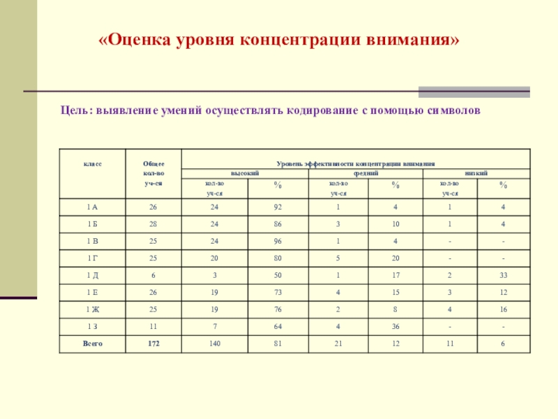 Высокий уровень эффективности концентрации внимания выявлен в следующих классах: