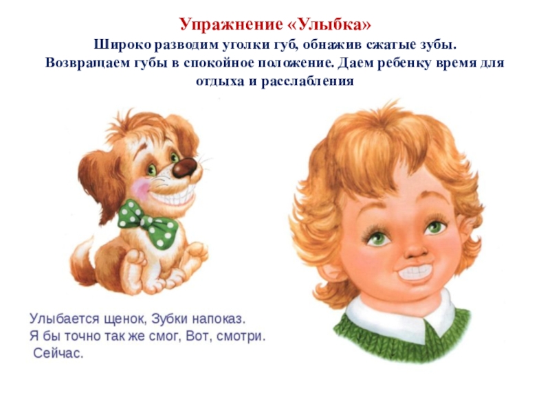 Слайд 6Упражнение «Улыбка» Широко разводим уголки губ, обнажив сжатые зубы. Возвращаем губы в спокойное