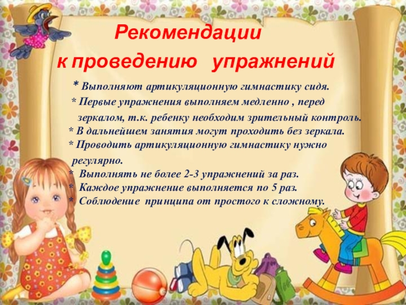зеркалом, т.к. ребенку необходим зрительный контроль. * В дальнейшем занятия могут проходить без зеркала. * Проводить артикуляционную гимнастику нужно