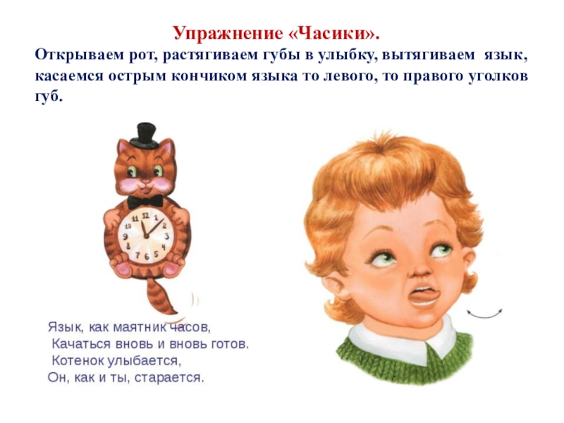 Упражнение «Часики». Открываем рот, растягиваем губы в улыбку, вытягиваем язык, касаемся острым кончиком языка то левого, то правого уголков губ.