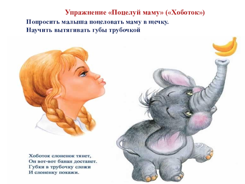 Упражнение «Поцелуй маму» («Хоботок») Попросить малыша поцеловать маму в щечку. Научить вытягивать губы трубочкой