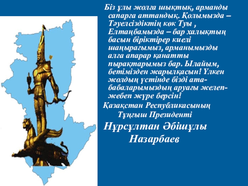 Слайд 45 Біз ұлы жолға шықтық, арманды сапарға аттандық. Қолымызда – Тәуелсіздіктің