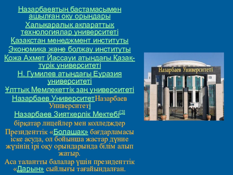 Слайд 14Назарбаевтың бастамасымен ашылған оқу орындары