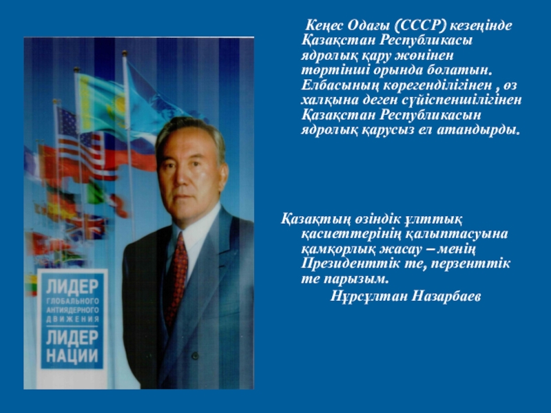 қару жөнінен төртінші орында болатын. Елбасының көрегенділігінен , өз халқына деген сүйіспеншілігінен Қазақстан Республикасын ядролық қарусыз ел атандырды.