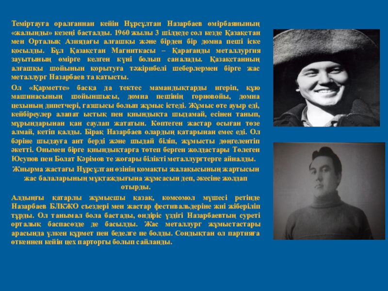Слайд 7Теміртауға оралғаннан кейін Нұрсұлтан Назарбаев өмірбаянының «жалынды» кезеңі басталды. 1960 жылы