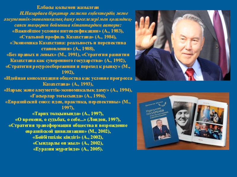 «Без правых и левых» (М., 1991), «Стратегия развития Казахстана как суверенного государства» (А., 1992),
