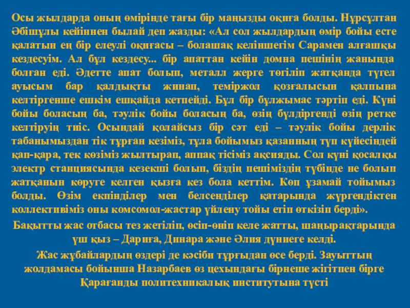 Слайд 8Осы жылдарда оның өмірінде тағы бір маңызды оқиға болды. Нұрсұлтан Әбішұлы