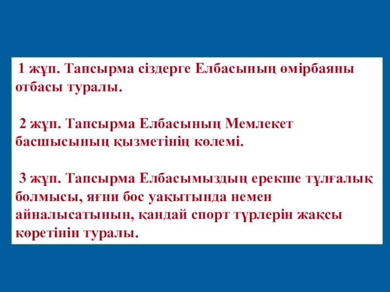 3 жұп. Тапсырма Елбасымыздың ерекше тұлғалық болмысы, яғни бос уақытында немен айналысатынын, қандай спорт түрлерін жақсы көретінін туралы.