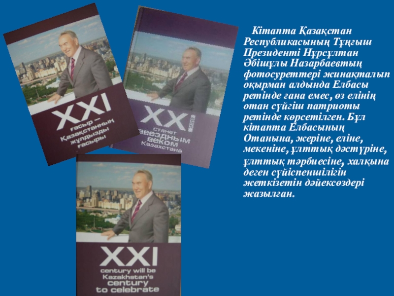 Кітапта Қазақстан Республикасының Тұңғыш Президенті Нұрсұлтан Әбішұлы Назарбаевтың фотосуреттері