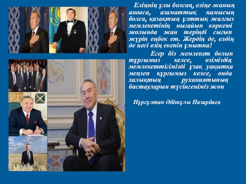 Слайд 20 Еліңнің ұлы болсаң, еліңе жаның ашыса, азаматтық намысың болса, қазақтың
