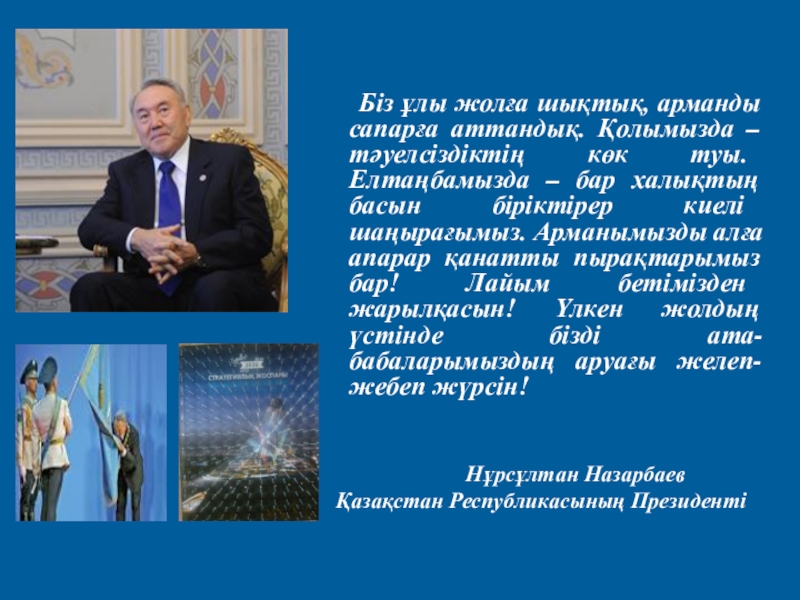 ұлы жолға шықтық, арманды сапарға аттандық. Қолымызда – тәуелсіздіктің көк туы. Елтаңбамызда – бар халықтың басын біріктірер киелі шаңырағымыз. Арманымызды алға апарар қанатты пырақтарымыз бар! Лайым бетімізден жарылқасын! Үлкен жолдың үстінде бізді ата-бабаларымыздың аруағы желеп-жебеп жүрсін!