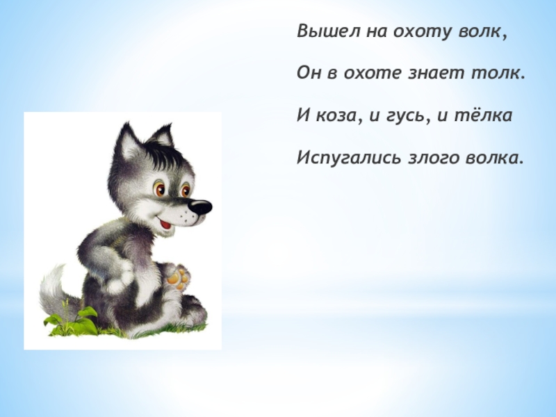Вышел на охоту волк, Он в охоте знает толк. И коза, и гусь, и тёлка Испугались злого
