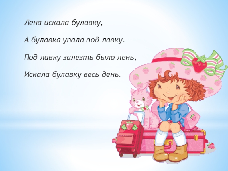 Лена искала булавку, А булавка упала под лавку. Под лавку залезть было лень, Искала булавку весь день.