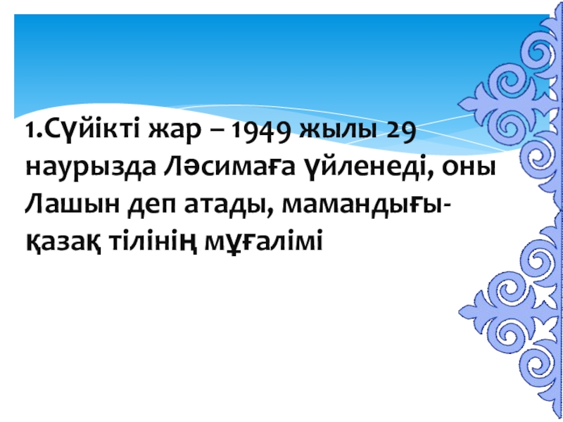 1.Сүйікті жар – 1949 жылы 29 наурызда Ләсимаға үйленеді, оны Лашын