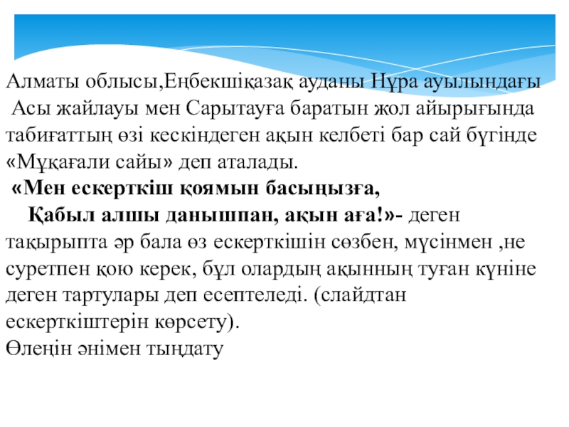 Слайд 17Алматы облысы,Еңбекшіқазақ ауданы Нұра ауылындағы