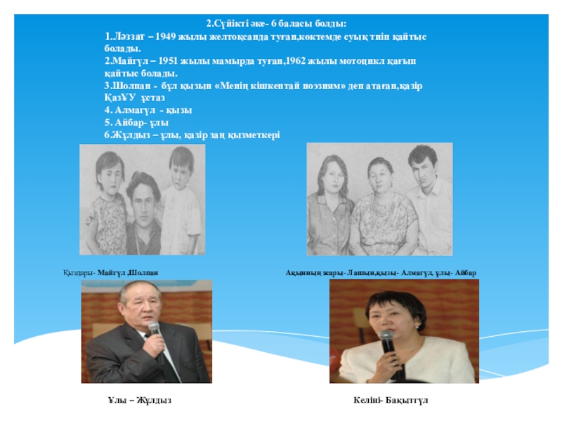 Қыздары- Майгүл ,Шолпан Ақынның жары- Лашын,қызы- Алмагүл, ұлы- Айбар