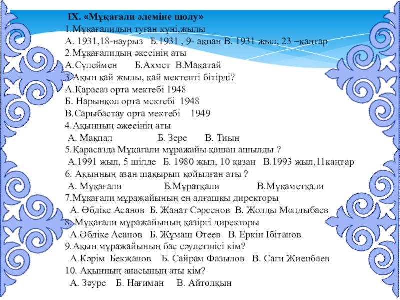 Слайд 25Мұқағали Мақатаевқа арналған мұражай