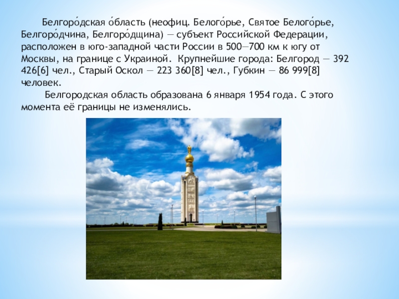 Слайд 2 Белгоро́дская о́бласть (неофиц. Белого́рье, Святое Белого́рье, Белгоро́дчина,