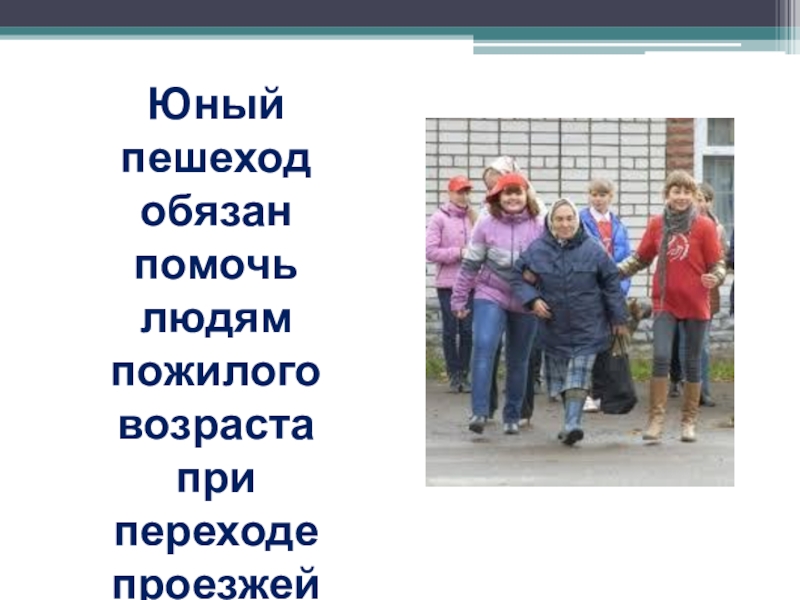 Юный пешеходобязан помочь людям пожилого возрастапри переходе проезжей части!
