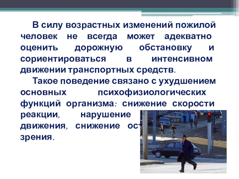 В силу возрастных изменений пожилой человек не всегда может адекватно оценить дорожную обстановку и сориентироваться в интенсивном