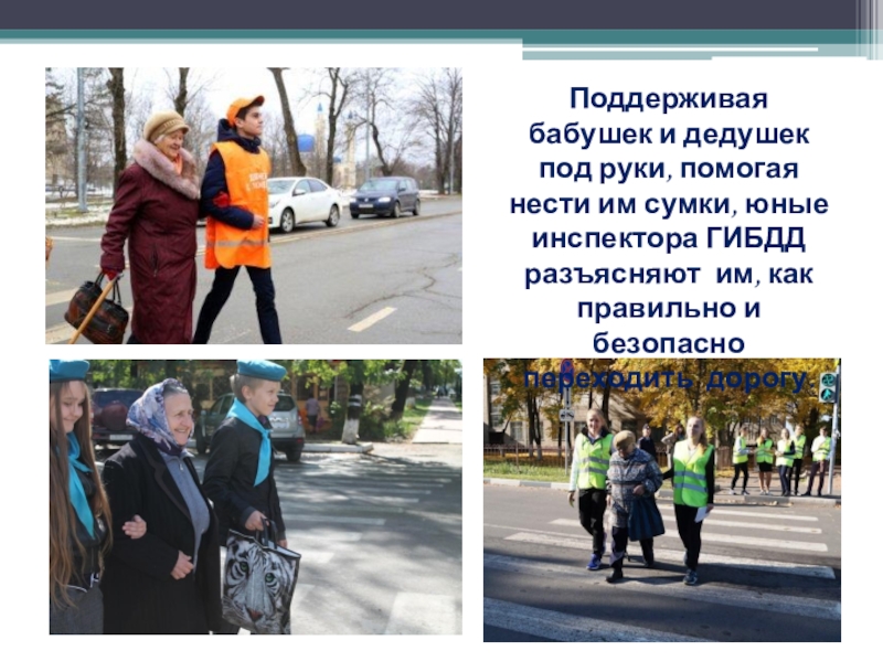 Слайд 11Поддерживая бабушек и дедушек под руки, помогая нести им сумки, юные