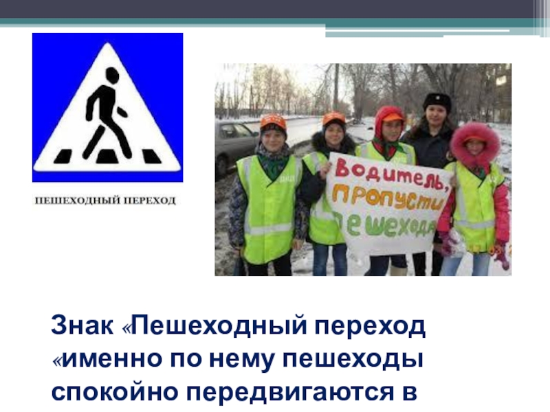 Слайд 12Знак «Пешеходный переход «именно по нему пешеходы спокойно передвигаются в городах.