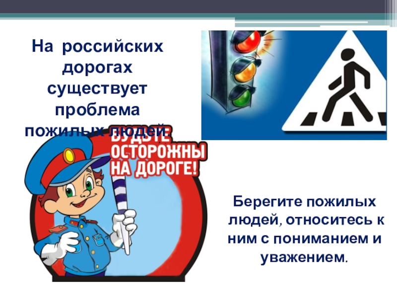 На российских дорогах существует проблема пожилых людей.Берегите пожилых людей, относитесь к ним с пониманием и уважением.