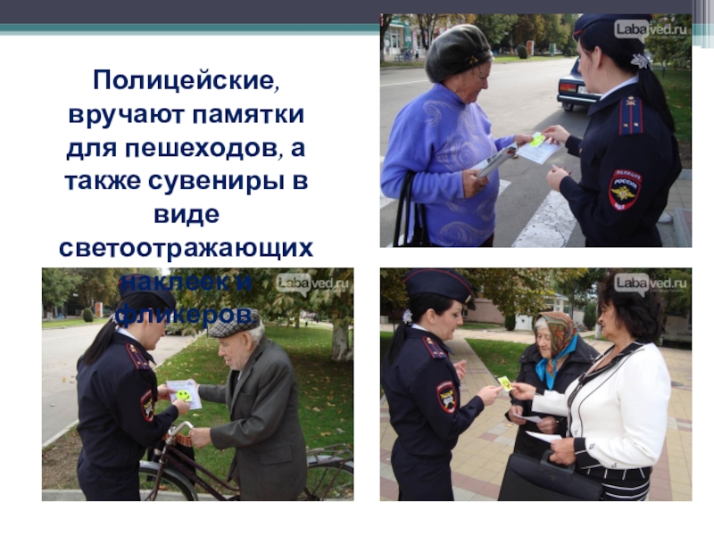 Слайд 9Полицейские, вручают памятки для пешеходов, а также сувениры в виде светоотражающих