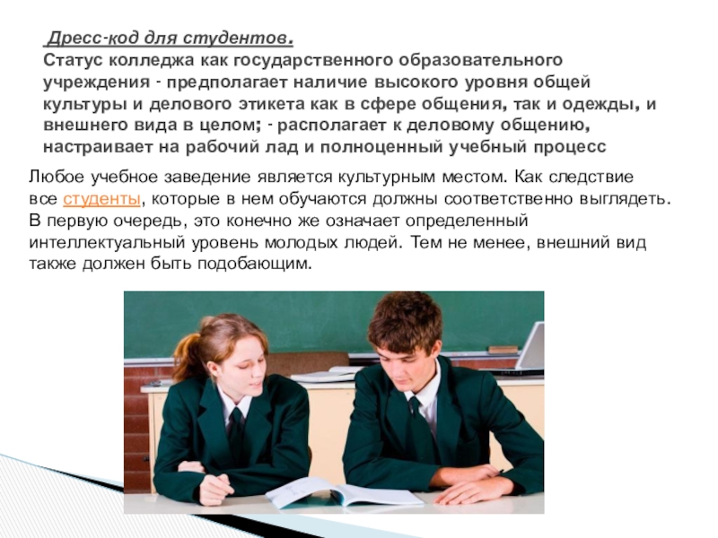 Любое учебное заведение является культурным местом. Как следствие все студенты, которые в нем обучаются должны соответственно выглядеть. В первую очередь, это конечно же означает определенный интеллектуальный уровень молодых людей. Тем не менее, внешний вид также должен быть подобающим.