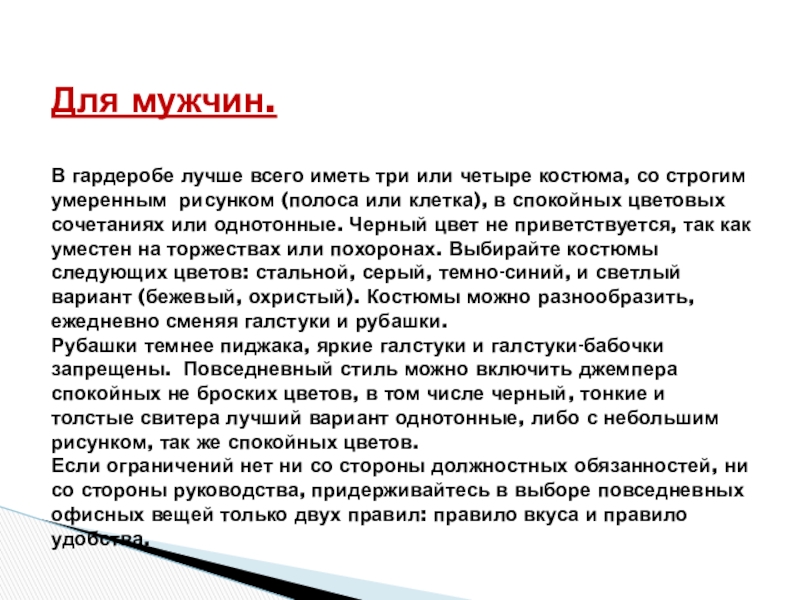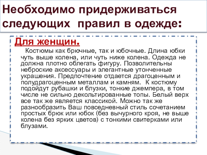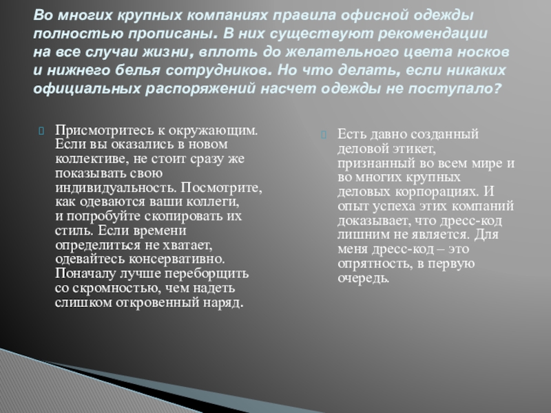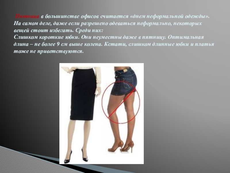 Во многих крупных компаниях правила офисной одежды полностью прописаны. В них существуют рекомендации на все случаи жизни, вплоть до желательного цвета носков и нижнего белья сотрудников. Но что делать, если никаких официальных распоряжений насчет одежды не поступало?