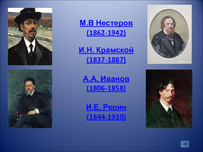 М.В Нестеров (1862-1942) И.Н. Крамской (1837-1887) А.А. Иванов (1806-1858) И.Е. Репин (1844-1930)