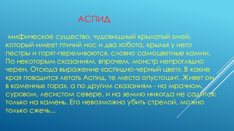 и два хобота, крылья у него пестры и горят-переливаются, словно самоцветные камни. По некоторым сказаниям, впрочем, монстр непроглядно черен. Отсюда выражение «аспидно-черный цвет». В какие края повадится летать Аспид, те места опустошит. Живет он в каменных горах, а по другим сказаниям - на мрачном, суровом, лесистом севере, и на землю никогда не садится: только на камень. Его невозможно убить стрелой, можно только сжечь...
