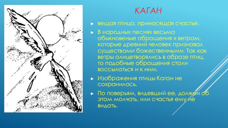 которые древний человек признавал существами божественными. Так как ветры олицетворялись в образе птиц, то подобные обращения стали воссылаться и к ним.