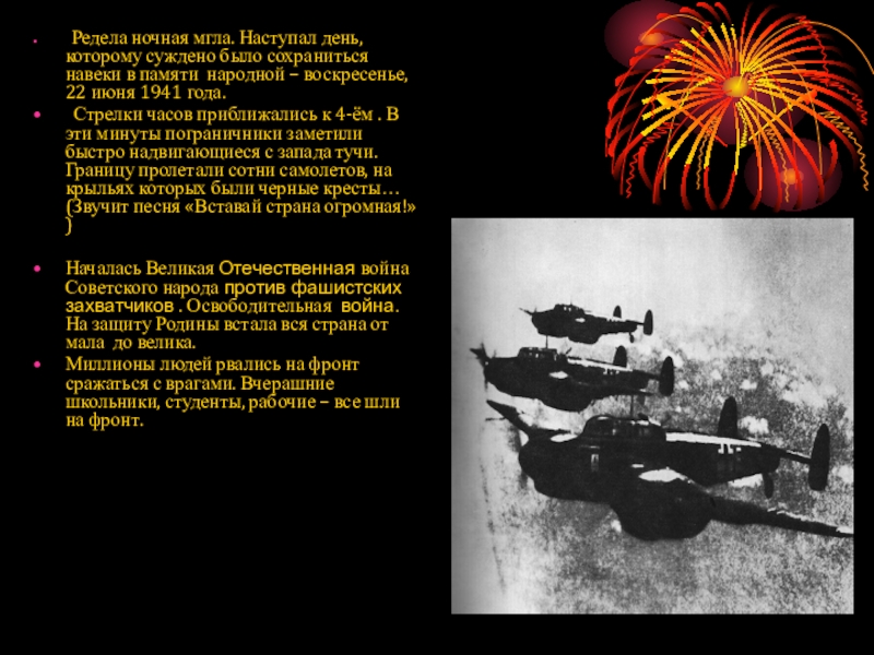 Стрелки часов приближались к 4-ём . В эти минуты пограничники заметили быстро надвигающиеся с запада тучи. Границу пролетали сотни самолетов, на крыльях которых были черные кресты… (Звучит песня «Вставай страна огромная!» )