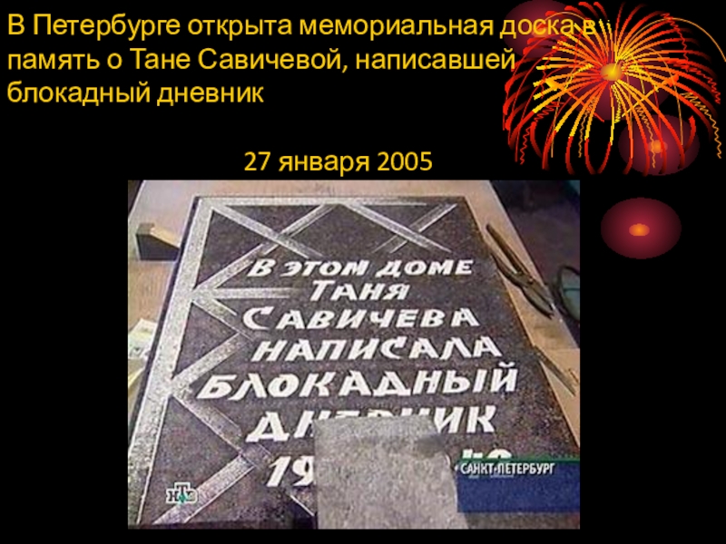 Слайд 27В Петербурге открыта мемориальная доска в память о Тане Савичевой, написавшей