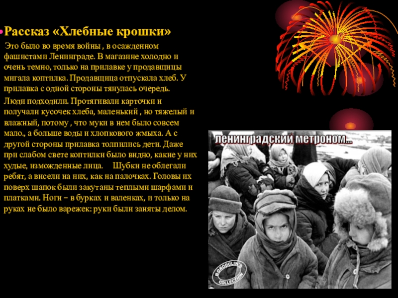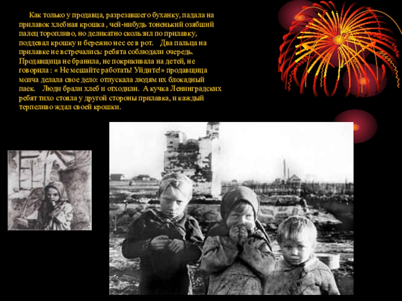 у продавца, разрезавшего буханку, падала на прилавок хлебная крошка , чей-нибудь тоненький озябший палец торопливо, но деликатно скользил по прилавку, поддевал крошку и бережно нес ее в рот. Два пальца на прилавке не встречались: ребята соблюдали очередь. Продавщица не бранила, не покрикивала на детей, не говорила : « Не мешайте работать! Уйдите!» продавщица молча делала свое дело: отпускала людям их блокадный паек. Люди брали хлеб и отходили. А кучка Ленинградских ребят тихо стояла у другой стороны прилавка, и каждый терпеливо ждал своей крошки.
