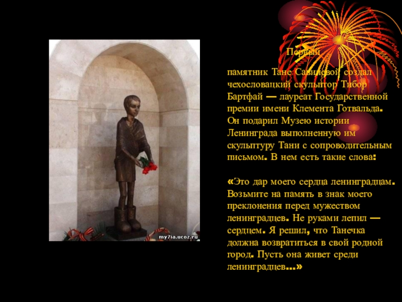 Слайд 30памятник Тане Савичевой создал чехословацкий скульптор Тибор Бартфай — лауреат Государственной