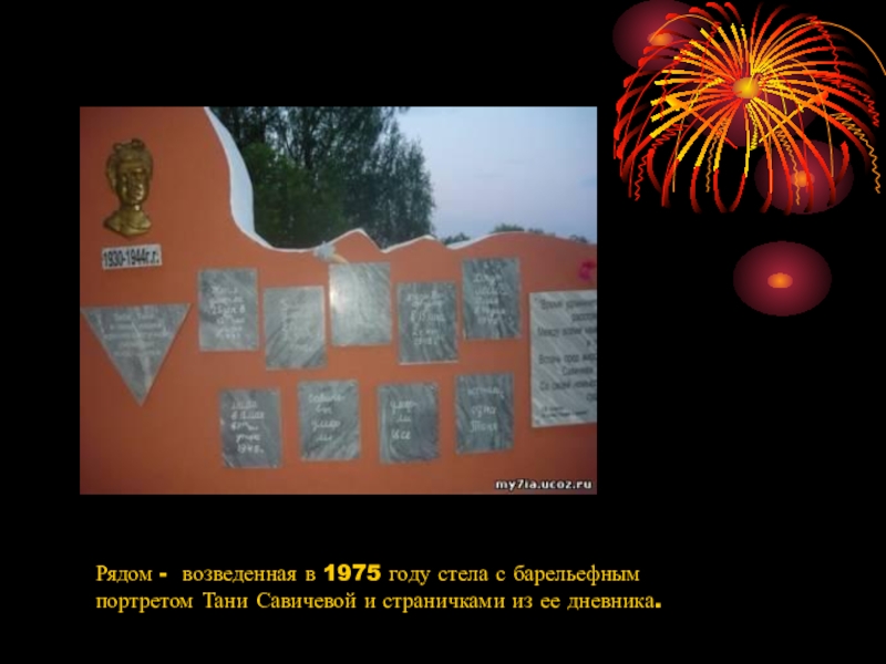 Слайд 32Рядом - возведенная в 1975 году стела с барельефным портретом Тани