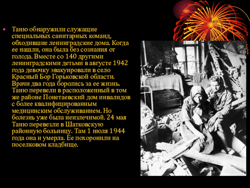 Слайд 26Таню обнаружили служащие специальных санитарных команд, обходившие ленинградские дома. Когда ее