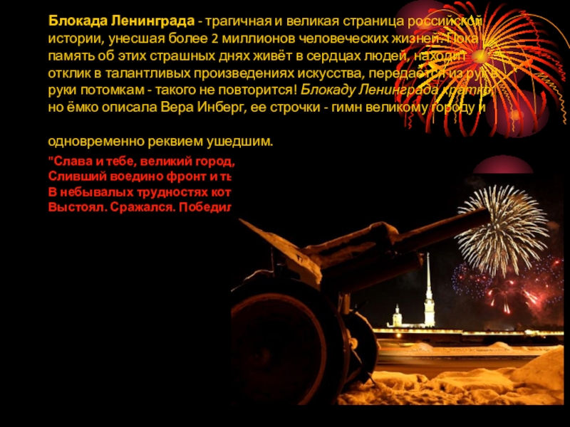 миллионов человеческих жизней. Пока память об этих страшных днях живёт в сердцах людей, находит отклик в талантливых произведениях искусства, передаётся из рук в руки потомкам - такого не повторится! Блокаду Ленинграда кратко, но ёмко описала Вера Инберг, ее строчки - гимн великому городу и одновременно реквием ушедшим.
