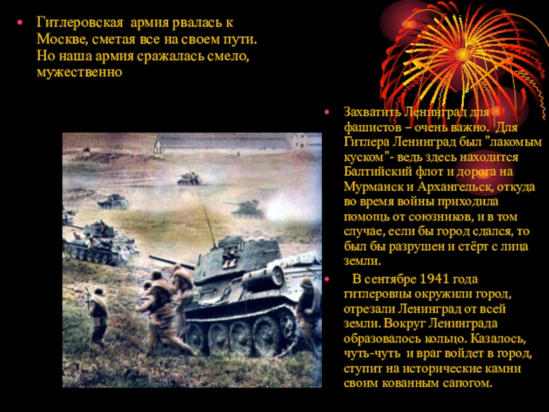 Захватить Ленинград для фашистов – очень важно. Для Гитлера Ленинград был "лакомым куском"- ведь здесь находится Балтийский флот и дорога на Мурманск и Архангельск, откуда во время войны приходила помощь от союзников, и в том случае, если бы город сдался, то был бы разрушен и стёрт с лица земли.