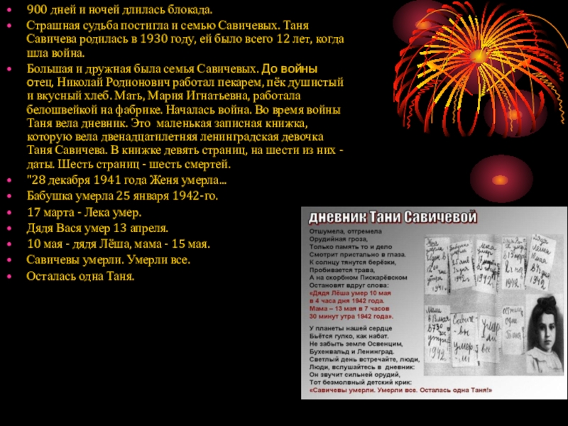 Большая и дружная была семья Савичевых. До войны отец, Николай Родионович работал пекарем, пёк душистый и вкусный хлеб. Мать, Мария Игнатьевна, работала белошвейкой на фабрике. Началась война. Во время войны Таня вела дневник. Это маленькая записная книжка, которую вела двенадцатилетняя ленинградская девочка Таня Савичева. В книжке девять страниц, на шести из них - даты. Шесть страниц - шесть смертей.