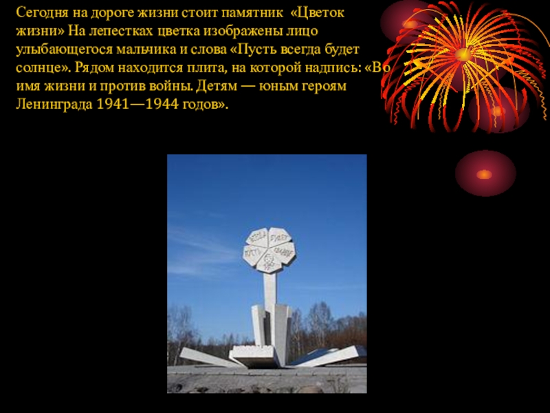 Слайд 23Сегодня на дороге жизни стоит памятник «Цветок жизни» На лепестках цветка