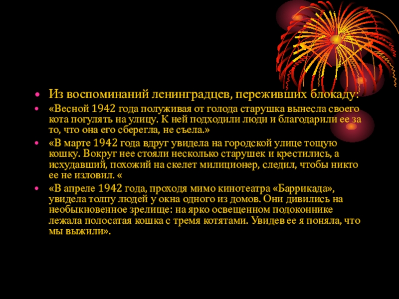 «В апреле 1942 года, проходя мимо кинотеатра «Баррикада», увидела толпу людей у окна одного из домов. Они дивились на необыкновенное зрелище: на ярко освещенном подоконнике лежала полосатая кошка с тремя котятами. Увидев ее я поняла, что мы выжили».