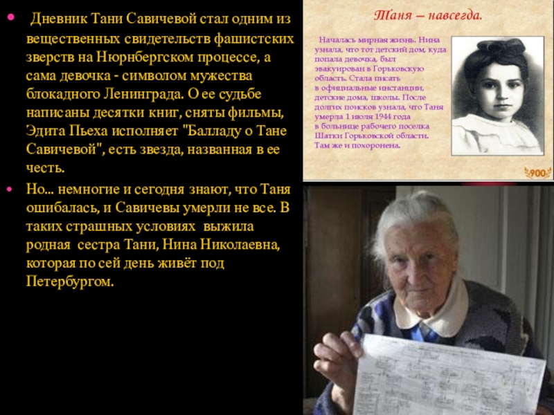 на Нюрнбергском процессе, а сама девочка - символом мужества блокадного Ленинграда. О ее судьбе написаны десятки книг, сняты фильмы, Эдита Пьеха исполняет "Балладу о Тане Савичевой", есть звезда, названная в ее честь.