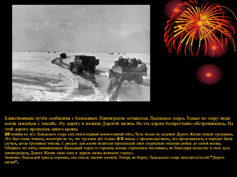 озеру люди могли связаться с землёй. Эту дорогу и назвали Дорогой жизни. Но эта дорога беспрестанно обстреливалась. На этой дороге пролилось много крови.