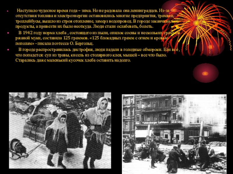 открывают нам страшную картину. На город обрушился страшный голод. Обесценились деньги и драгоценности. Эвакуация началась еще осенью 1941 года, но лишь в январе 1942 года появилась возможность вывести большое количество людей, в основном женщин и детей, через Дорогу Жизни. В булочные, где выдавался ежедневный паёк, были огромные очереди. Помимо голодаблокадный Ленинград атаковали и другие бедствия: очень морозные зимы, порой столбик термометра опускался до - 40 градусов. Закончилось топливо и замёрзли водопроводные трубы - город остался без света, и питьевой воды. Ещё одной бедой для осаждённого города первой блокадной зимой стали крысы. Они не только уничтожали запасы еды, но и разносили всевозможные инфекции. Люди умирали, и их не успевали хоронить, трупы лежали прямо на улицах. Появились случаи каннибализма и разбоев.