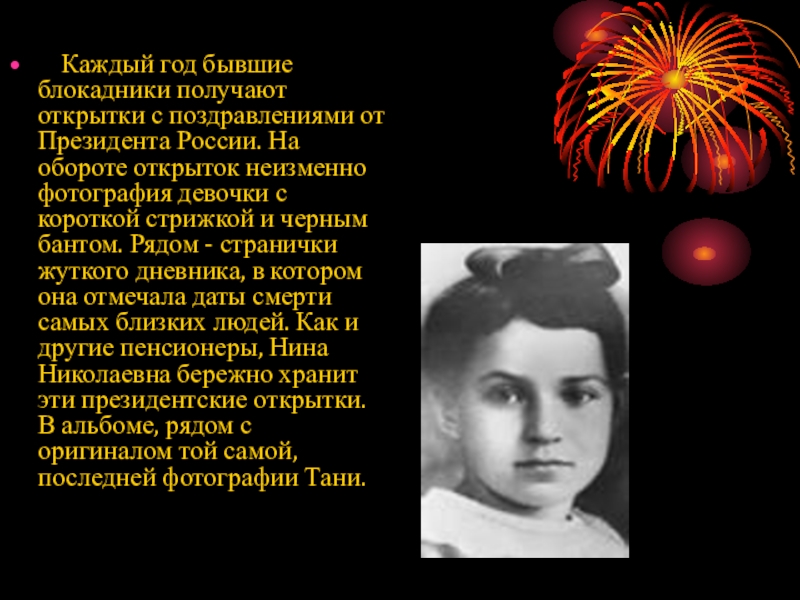 Президента России. На обороте открыток неизменно фотография девочки с короткой стрижкой и черным бантом. Рядом - странички жуткого дневника, в котором она отмечала даты смерти самых близких людей. Как и другие пенсионеры, Нина Николаевна бережно хранит эти президентские открытки. В альбоме, рядом с оригиналом той самой, последней фотографии Тани.