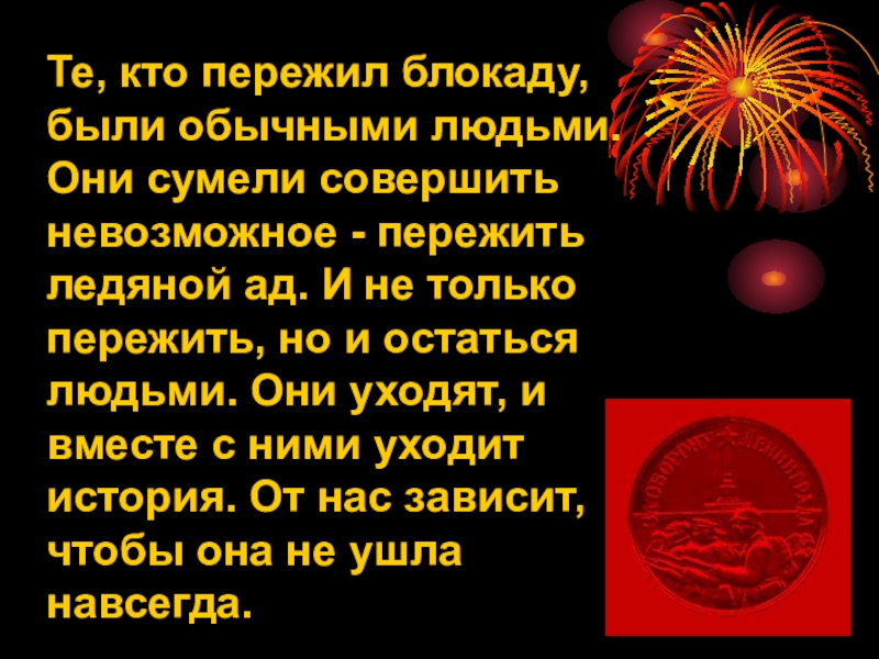 Слайд 42Те, кто пережил блокаду, были обычными людьми. Они сумели совершить невозможное