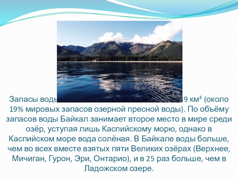 Слайд 8Запасы воды в Байкале гигантские — 23 615,39 км³ (около 19%